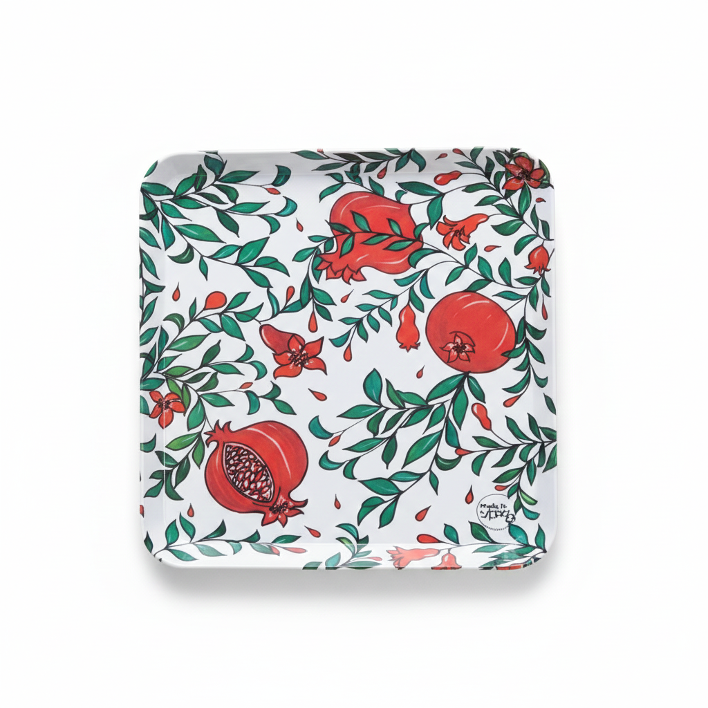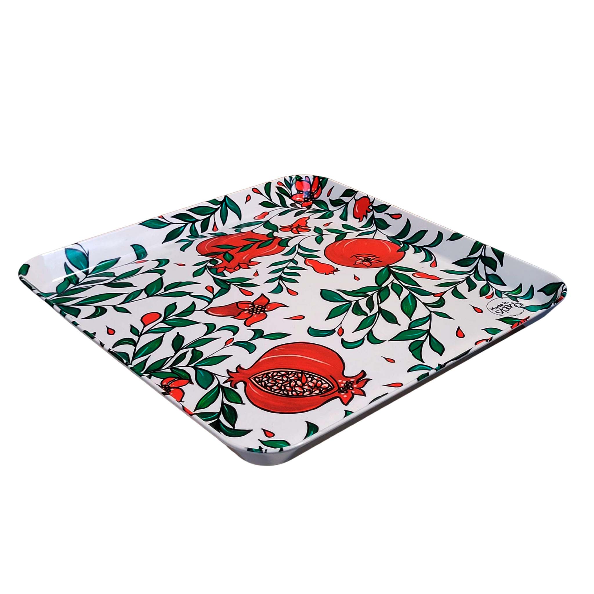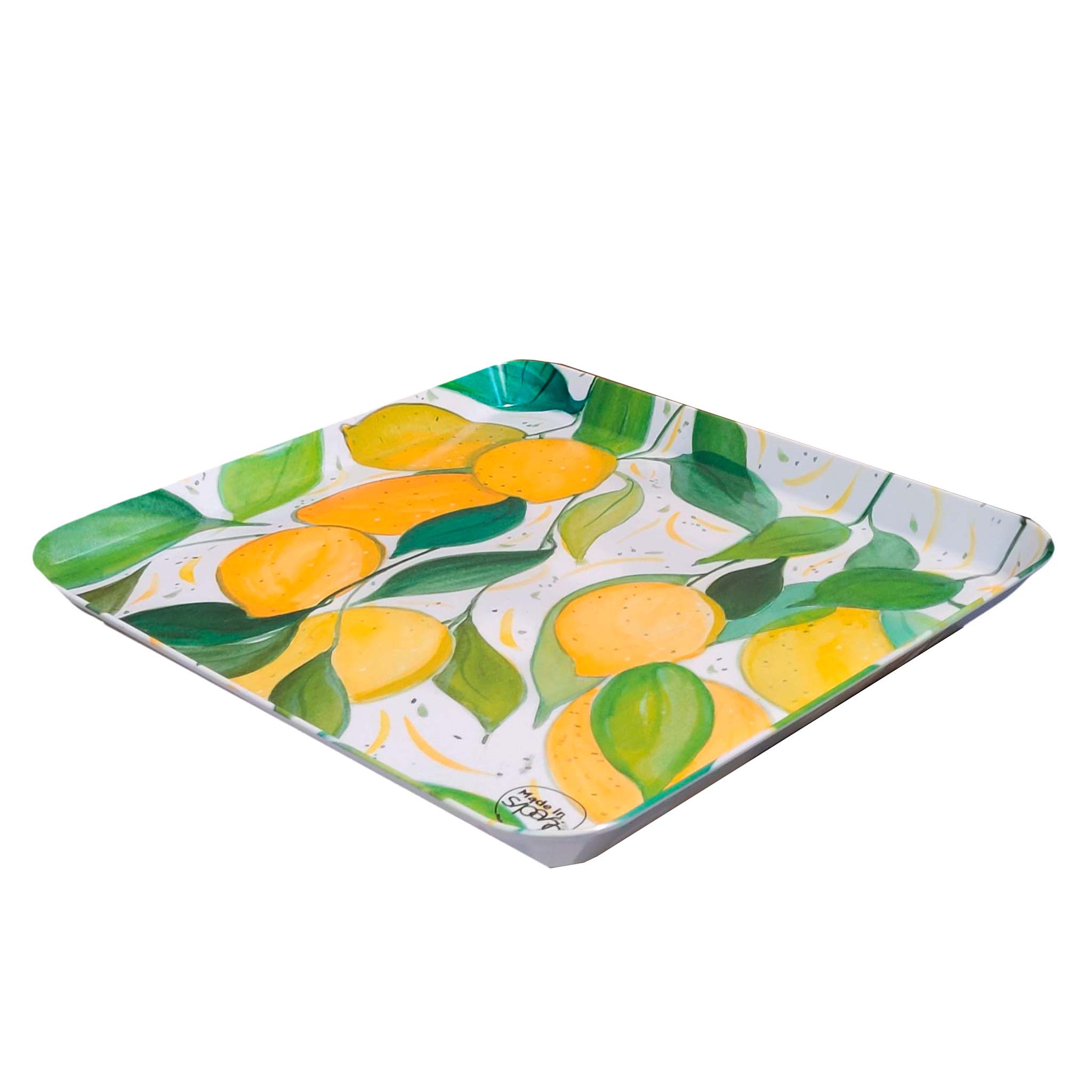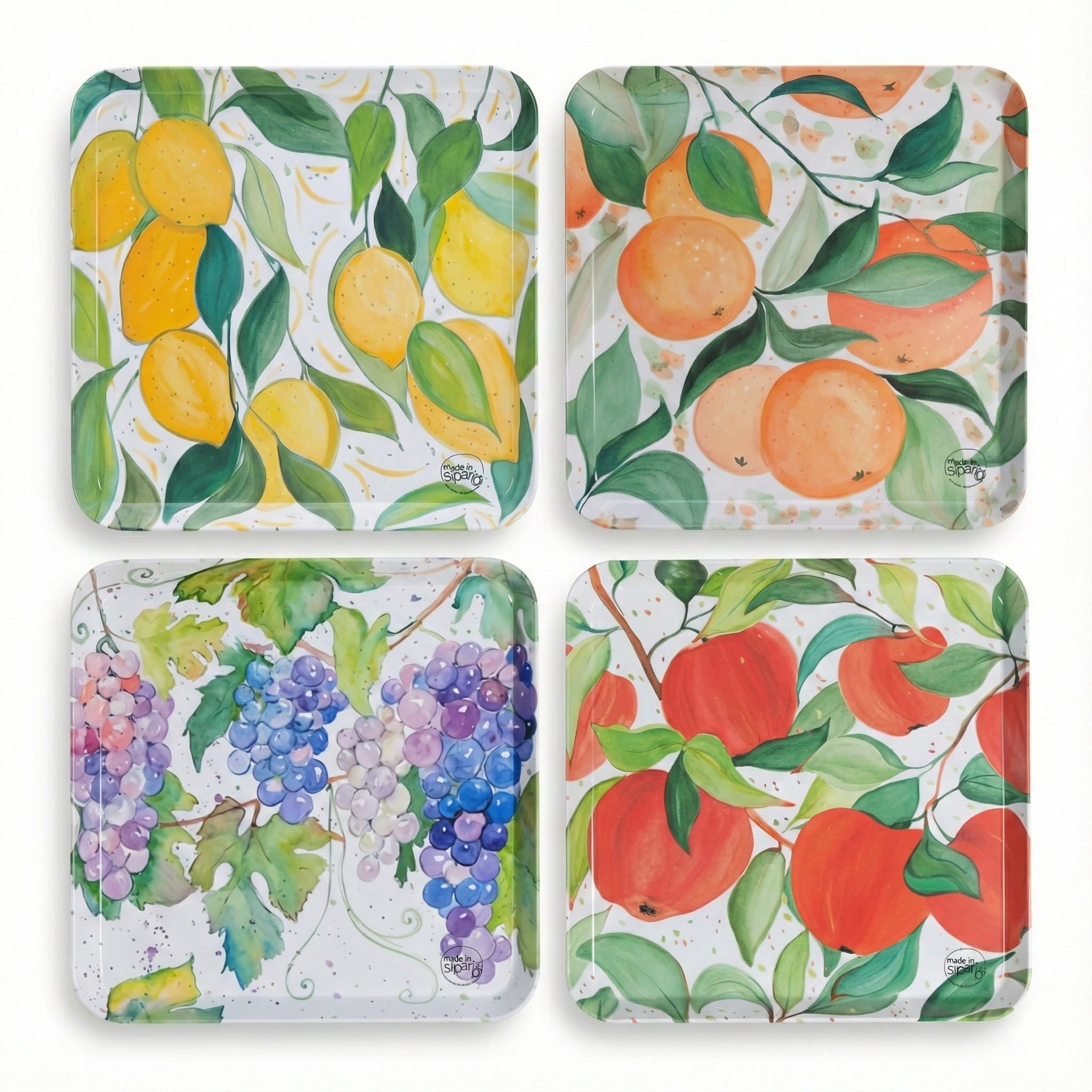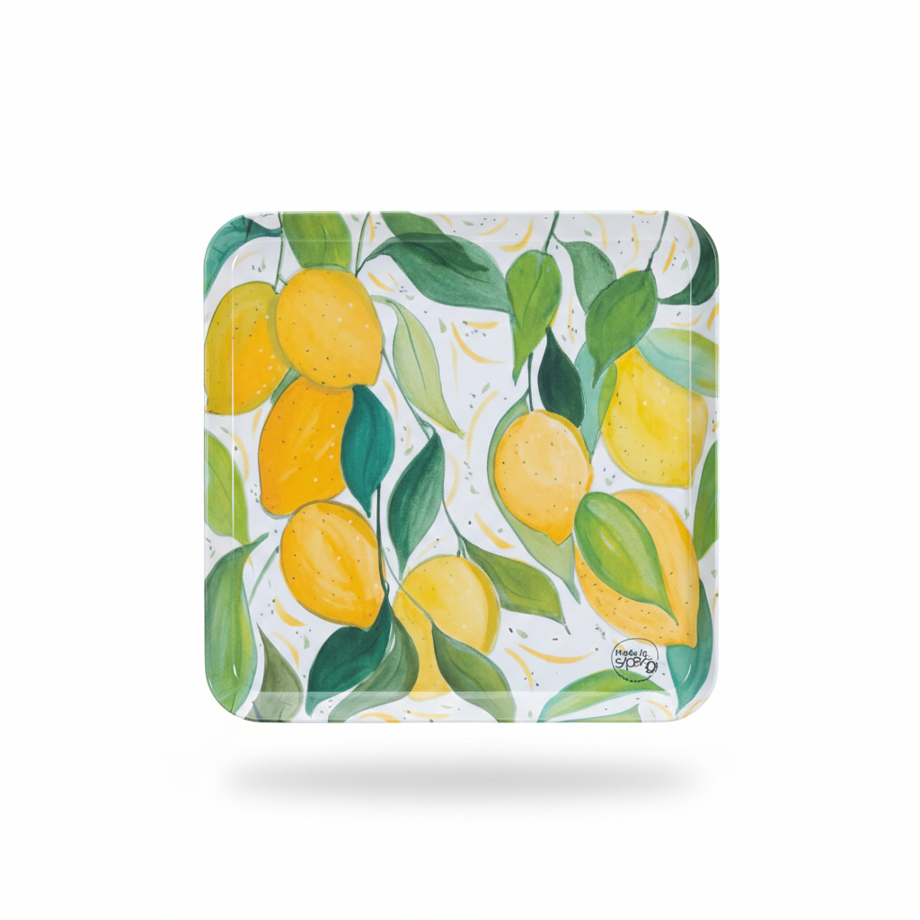 Vibrante e solare, il Vassoio Quadrato Linea Frutta porta sulla tua tavola tutta la freschezza del sole italiano. Ogni pezzo è impreziosito dai disegni acquerellati di limoni, arance, melagrane e frutti mediterranei, realizzati con cura e creatività dagli Artisti Speciali di Made in Sipario.