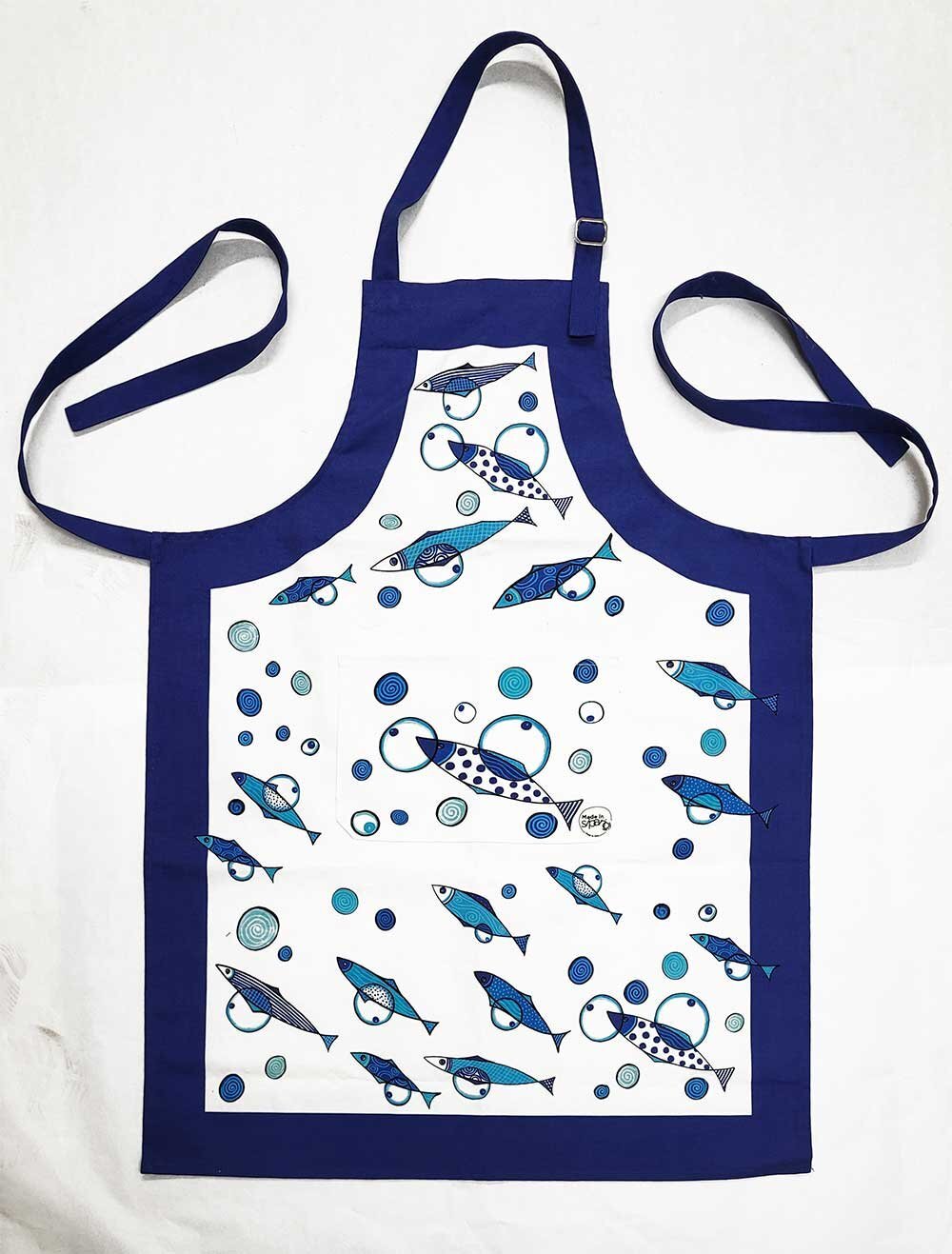 Un tocco di allegria e colore nella tua cucina con il grembiule della Linea Mare, decorato con la simpatica fantasia Acciughe.