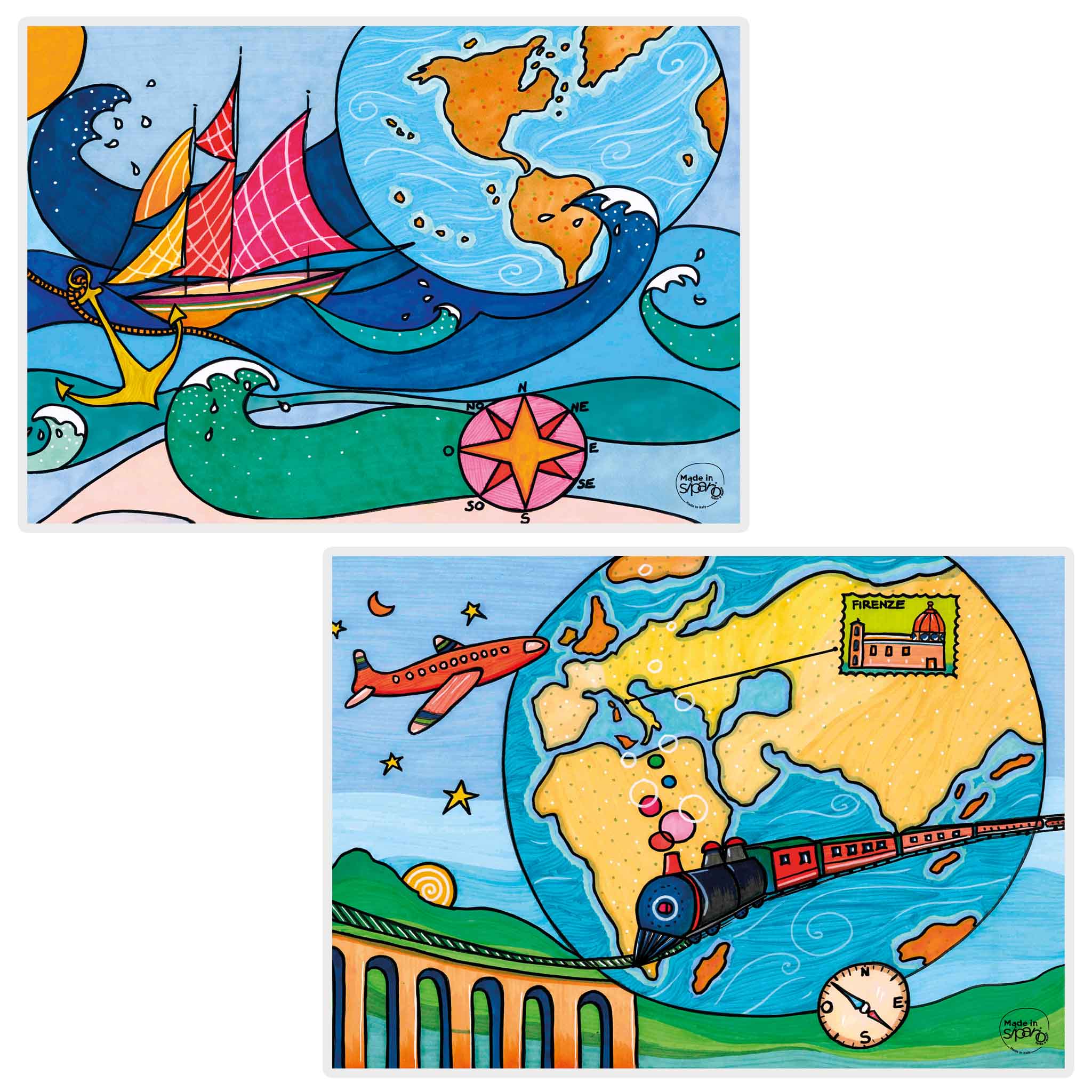 Ogni tovaglietta è realizzata in cartone, stampata a colori con fantasia originale Made in Sipario, plastificata in modo da renderla lavabile.